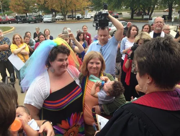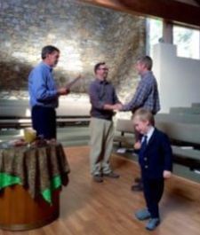 - In 2006, UU Asheville minister, Rev. Mark Ward, protested the state stance on same-sex marriages by refusing to perform civil marriages in North Carolina until the state recognized same-sex marriages. In October 2014, NC legalized gay marriage in a ruling on a lawsuit that Rev. Ward (along with other ministers of various denominations) was a plaintiff. (Pictured: Members William Smith and Ryan Williams hold hands as Rev. Mark Ward reads aloud in their wedding ceremony in 2015. Their son Rainier, serving as Best Man, is pictured in the foreground.)